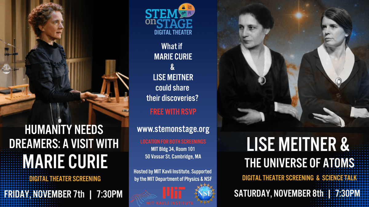 - Location: MIT, Building 34, Room 101 - 50 Vassar St., Cambridge, MA 02139- RSVP Required - DIGITAL THEATER SCREENING SCHEDULE- FRIDAY, NOVEMBER 7th, 2025 | 7:30PM- Digital Theater Screening (42 mins)- Step into the laboratory and life of two-time Nobel Prize winner Marie Skłodowska Curie. This cinematic adaptation of the acclaimed one-woman show features living history scholar Susan Marie Frontczak masterfully portraying Curie as she recounts her journey from childhood in Poland to groundbreaking research in France. Audiences are invited to join Curie on her quest to isolate polonium and radium as she pioneers the the field of radioactivity. HUMANITY NEEDS DREAMERS: A VISIT WITH MARIE CURIE breaks the digital fourth wall between theater and film, past and present. - Hosted by: Dr. Anna Frebel, Professor of Physics at MIT. - Post-Screening Q&A with filmmaker Jen Myronuk and performer Susan Marie Frontczak (virtual) - RSVP: MARIE CURIE - NOVEMBER 7th, 2025- SATURDAY, NOVEMBER 8th, 2025 | 7:30PM- Digital Theater Screening (30 mins) & Science Talk - Experience Austrian-Swedish physicist Lise Meitner's groundbreaking discovery of nuclear fission through a living history portrayal by MIT Professor of Physics Dr. Anna Frebel. - This debut cinematic performance explores how Meitner's century-old discoveries continue to inspire astronomers uncovering the cosmic origins of heavy elements. - Following the screening of LISE MEITNER & THE UNIVERSE OF ATOMS, join Dr. Frebel for a live presentation on her research into ancient stars and the stellar creation of elements like silver and gold. - RSVP: LISE MEITNER - NOVEMBER 8th- Sign up for STEM on Stage news & announcements!Full Name *Email *Message (optional)Checkbox (select all that apply)